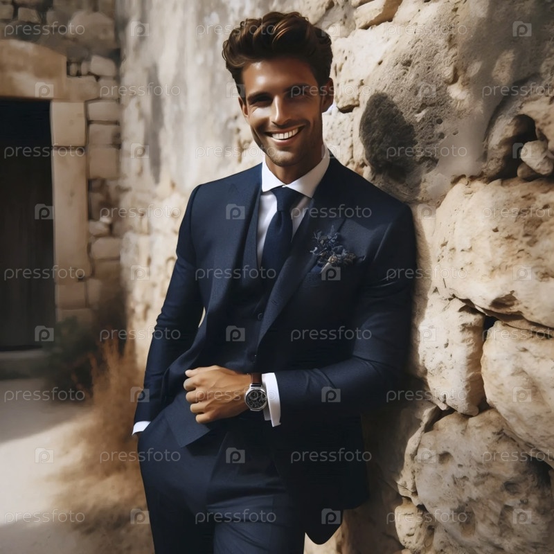 Смелый голубой свадебный костюм против деревенской стены, Ai generated image
