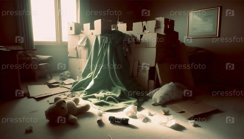 Развалившийся форт одеяла в пустой комнате, Ai generated image