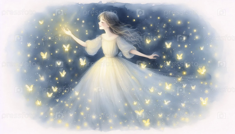 Принцесса в саду огненных мух акварельный арт-принт, Ai generated image