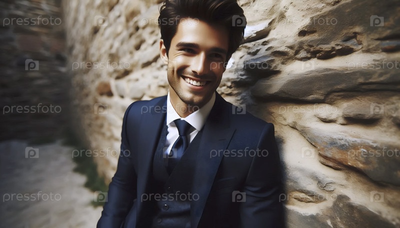 Смелый голубой свадебный костюм против деревенской стены, Ai generated image