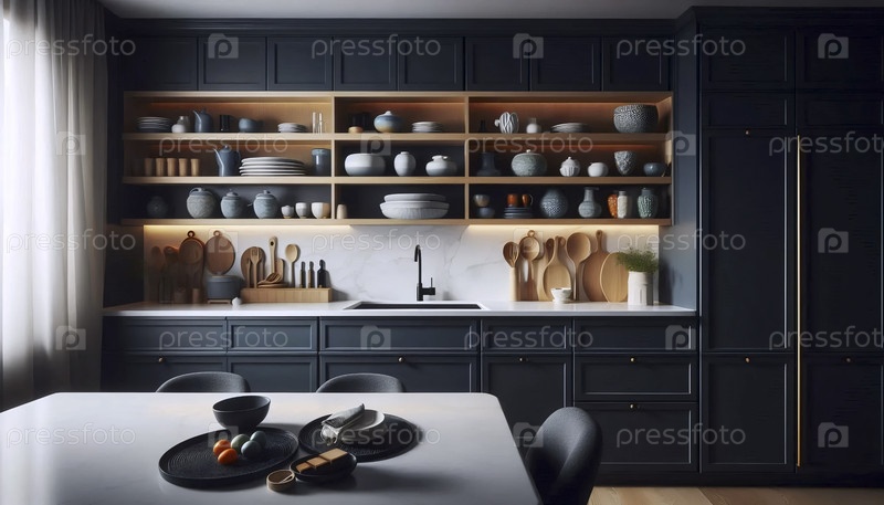 Голубая кухня из графита с дубовыми открытыми полками, Ai generated image