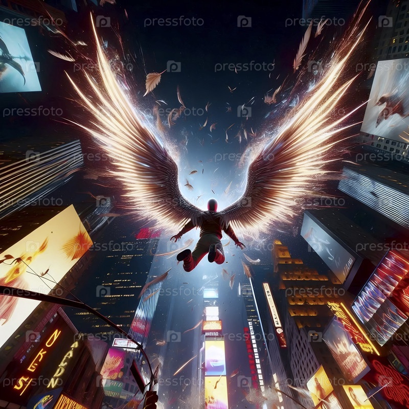 Ангел падает через Таймс-сквер Биллборд, Ai generated image