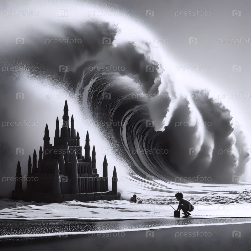 Ребенок, строящий крепость песчаного замка против надвигающегося прилива, Ai generated image