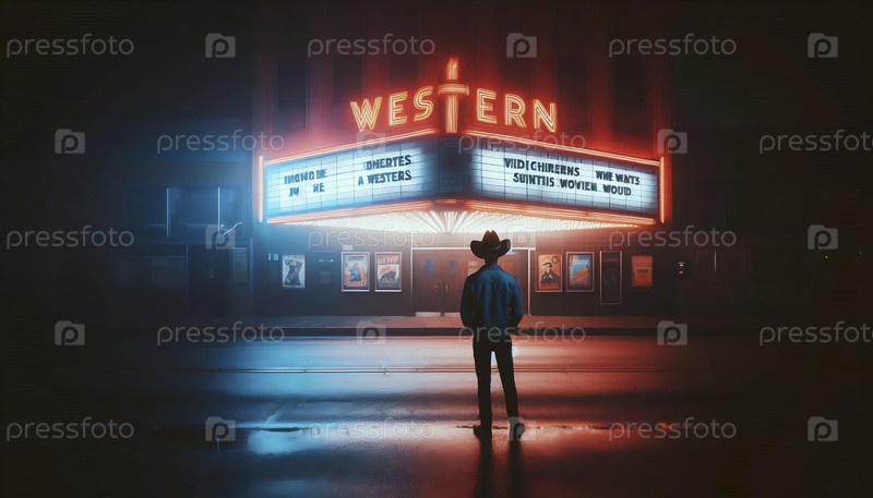 Одинокая фигура под возвышающейся маркизой кинотеатра, Ай генерирует изображение