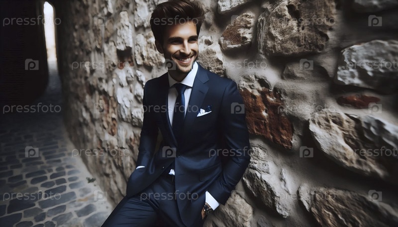 Смелый голубой свадебный костюм против деревенской стены, Ai generated image