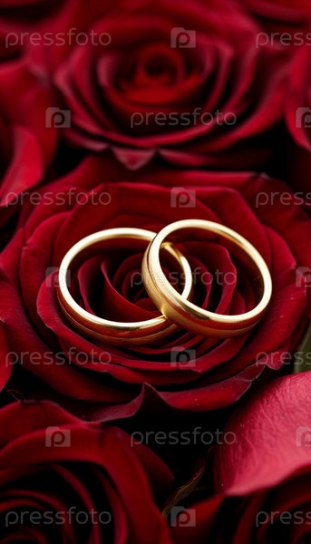 Два обручальных кольца с свадебными цветами, красные розы и золотые кольца