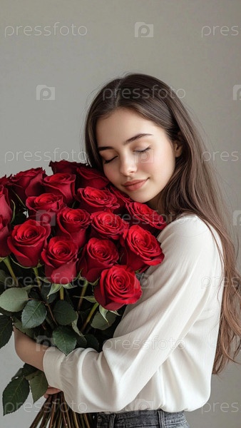 Счастливая женщина держит в руках букет роз, прячет лицо за букетом ароматных красных роз. 8 марта. День Рождения. Букет красивых красных роз в руках девушки