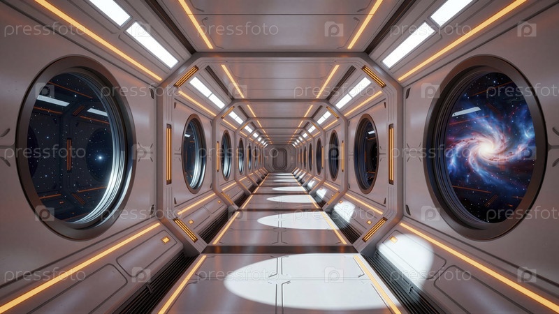 Футуристический интерьер космического корабля с видом на звезды