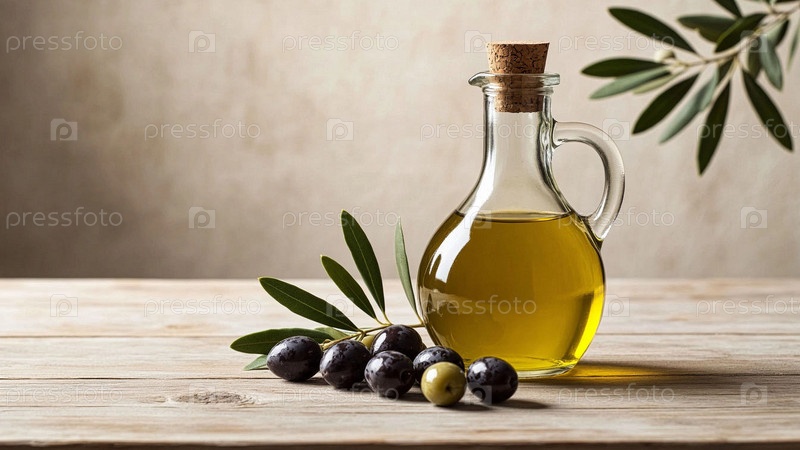 Оливковое масло в стеклянном сосуде. Свежее оливковое масло на деревянном столе