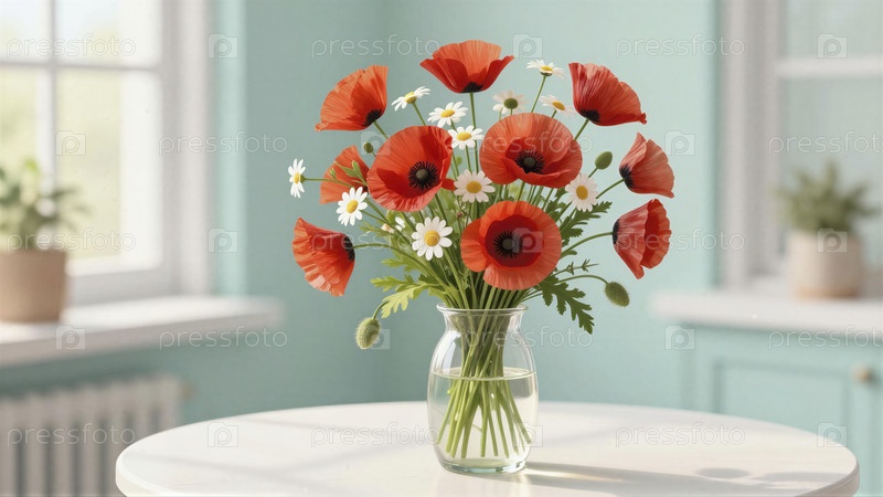 Букет маков и ромашек в стеклянной вазе А