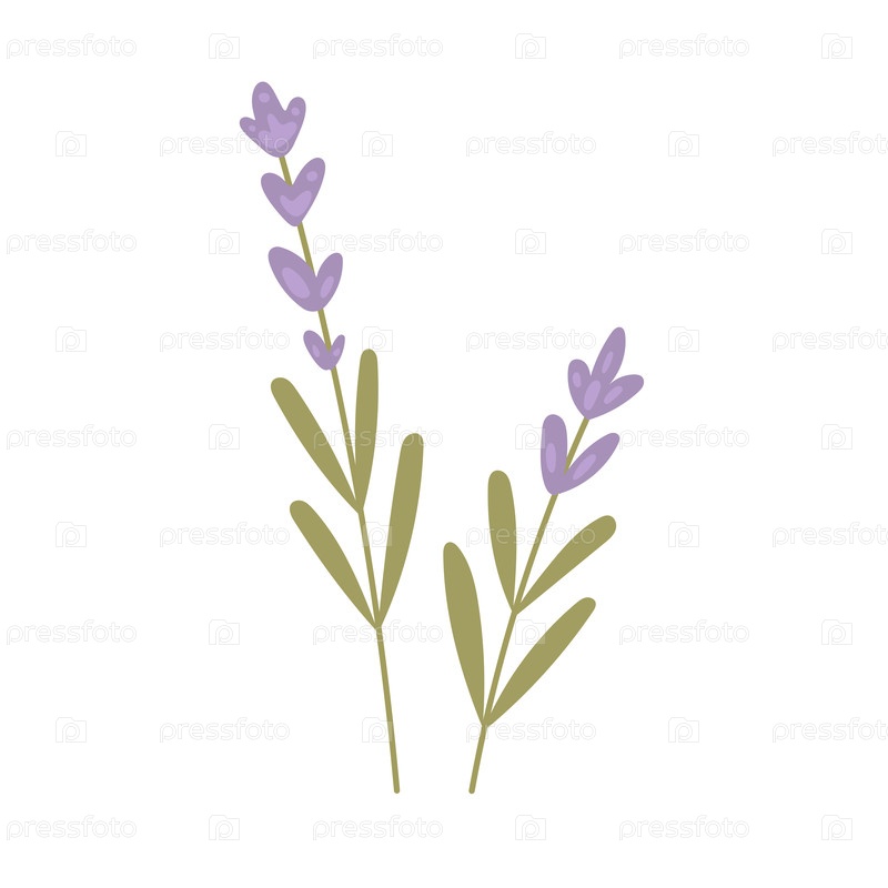 Два тонких стебля лаванды с листьями в простой композиции, подходящие для минимального цветочного дизайна, травяного образования и чистого использования клипарта