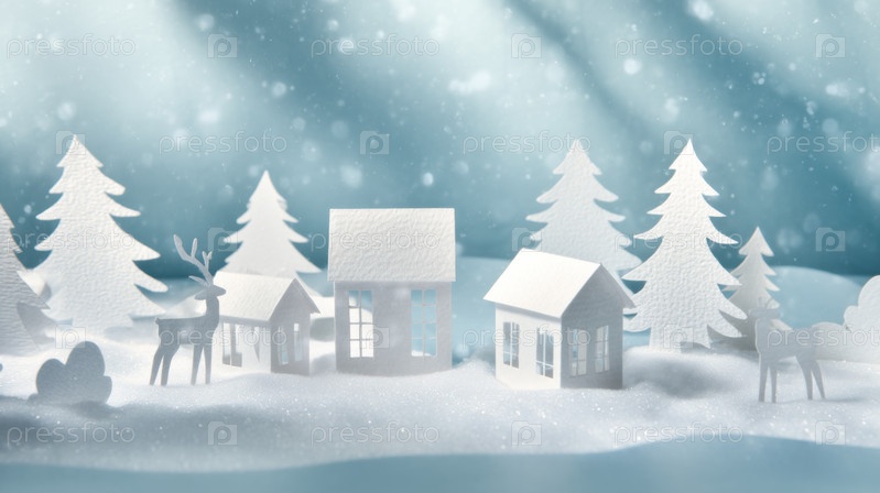 Бумажная зимней деревушка со снежными деревьями и силуэтами оленей, очаровательная для рождественской иллюстрации, праздничного декора и сезонного повествования