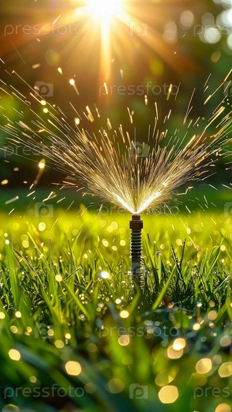 Автоматический разбрызгиватель поливает зеленую траву на участке. Полив молодого зеленого газона водой