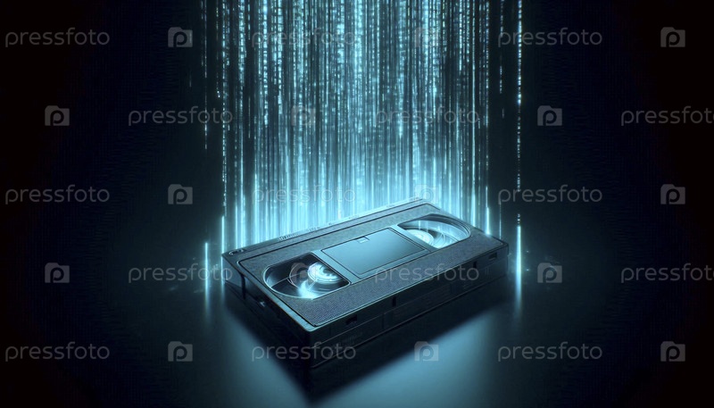 Светящийся циановый макет VHS-ленты, подвешенный в темном пространстве с цифровым дождем, Ai создал изображение
