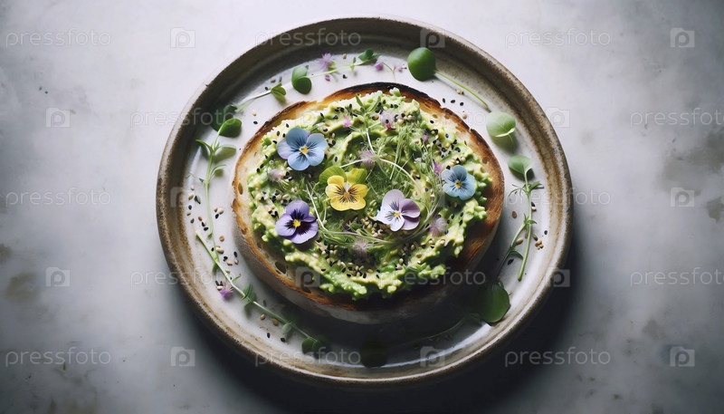 Небольшой круглый тост из авокадо с съедобными цветами и семенами кунжута на ручной керамической тарелке, Ai generated image