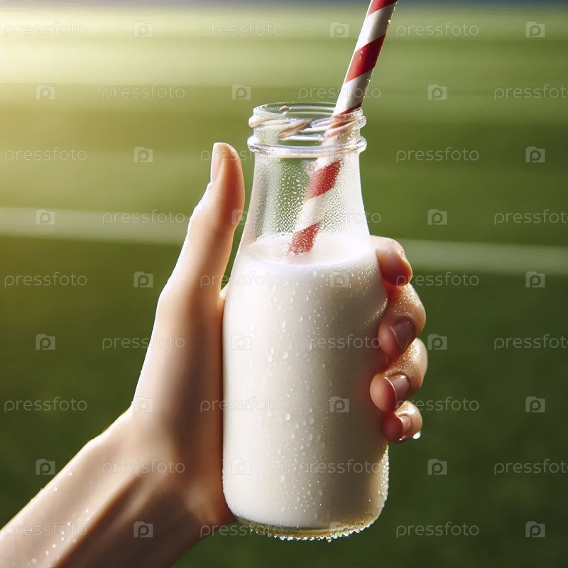 Ближайший план руки, держащей прозрачную стеклянную бутылку с молоком со смелой красно-белой бумажной соломой, Ай создал изображение