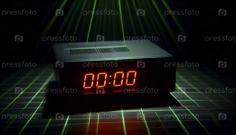 Мокет черного цифрового будильника с красными LED-номерами, в темной комнате с лазерной сеткой