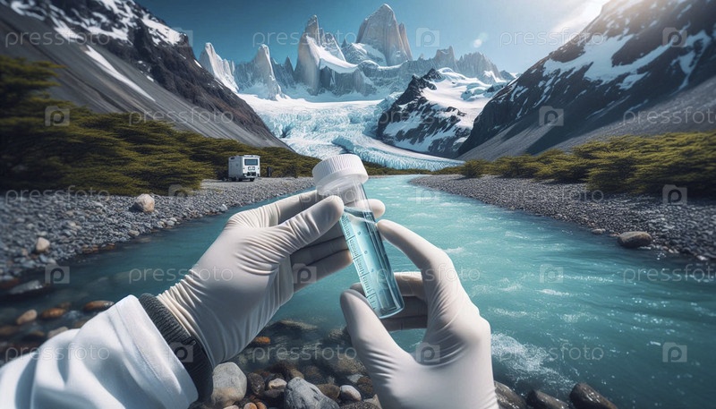 Команда ученых-экологов берет образец воды из нетронутой ледниковой реки, Ai generated image