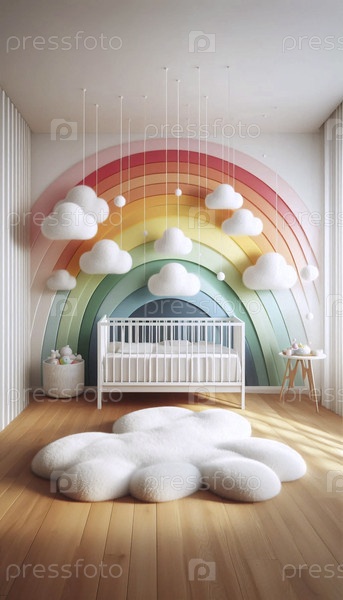 Игровая стена на тему радуги с висящими облаками ткани и пушистым ковром в форме облака, Ai создала изображение