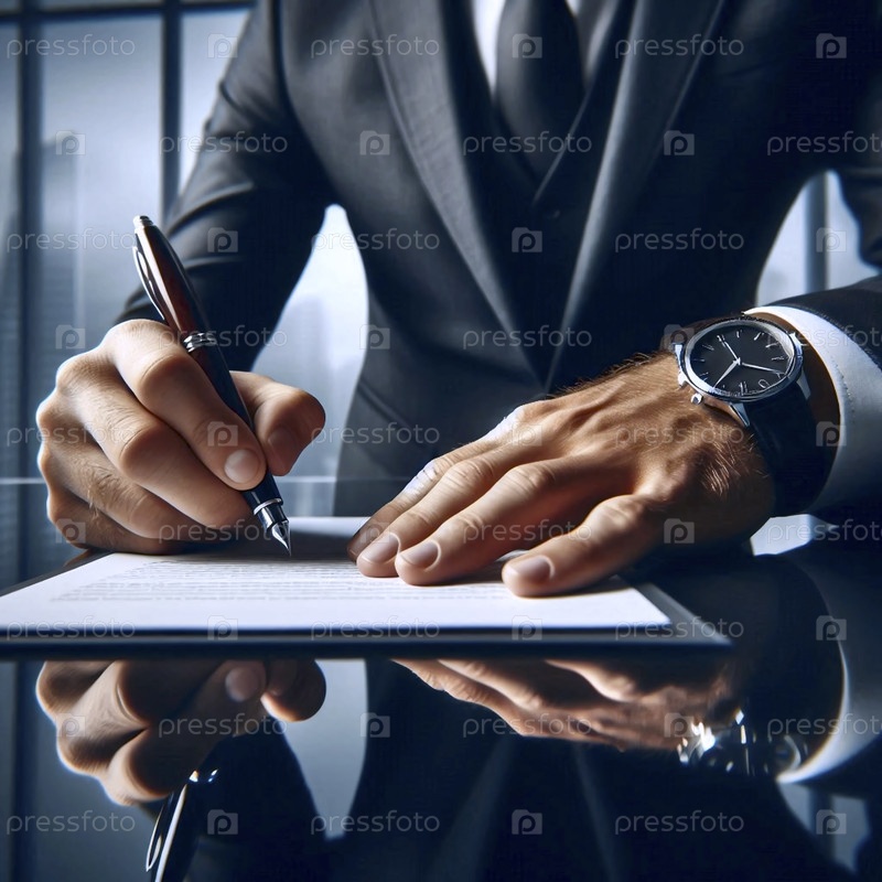 Уверенный в себе предприниматель подписывает крупный контракт, сосредоточившись на решающей руке и ручке