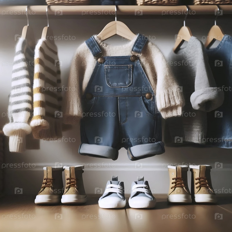 Милый, организованный шкаф с крошечной одеждой на миниатюрных вешальниках и маленькой обувью, выстроенной ниже, Ai generated image