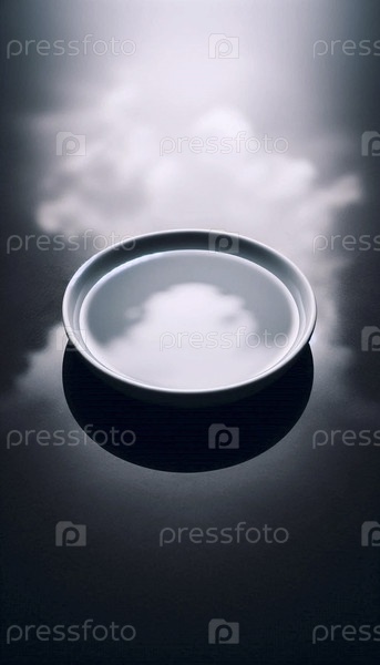 Мокет одной белой фарфоровой пластины, плавающей в бассейне мелководной воды, Ai generated image