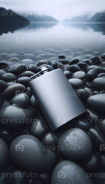 Мокет бутылки из нержавеющей стали на гранитном пляже, Ai generated image