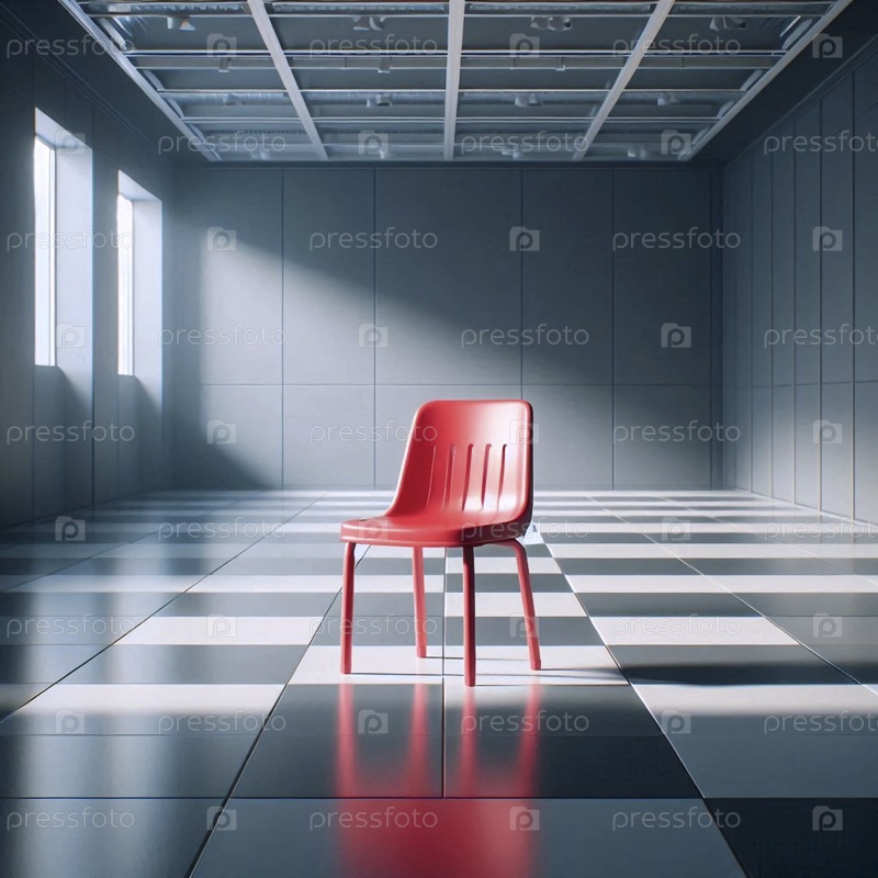 Мокет одного ярко-красного формованного пластикового стула в пустом виртуальном выставочном зале, Ai generated image