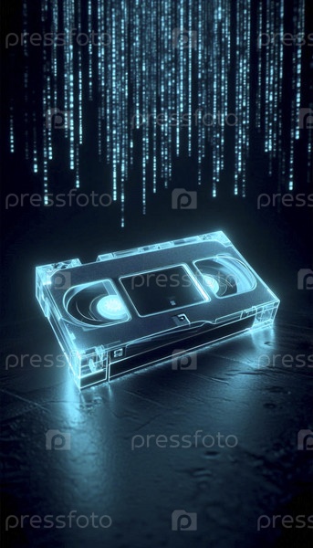 Светящийся циановый макет VHS-ленты, подвешенный в темном пространстве с цифровым дождем, Ai создал изображение