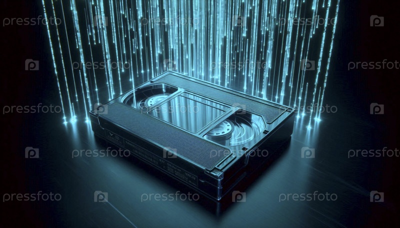 Светящийся циановый макет VHS-ленты, подвешенный в темном пространстве с цифровым дождем, Ai создал изображение