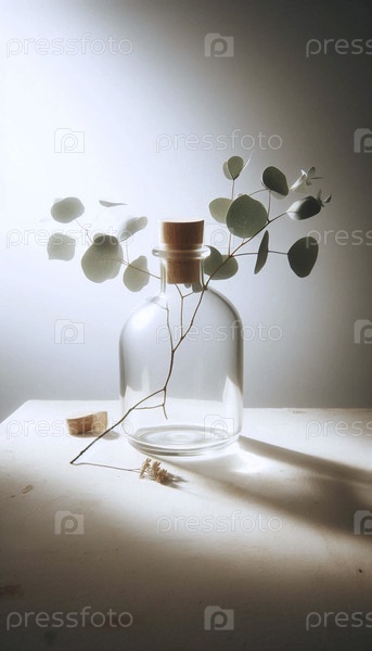 Мокет пустой прозрачной стеклянной бутылки с пробкой, рядом с высушенным эвкалиптом, Ai generated image
