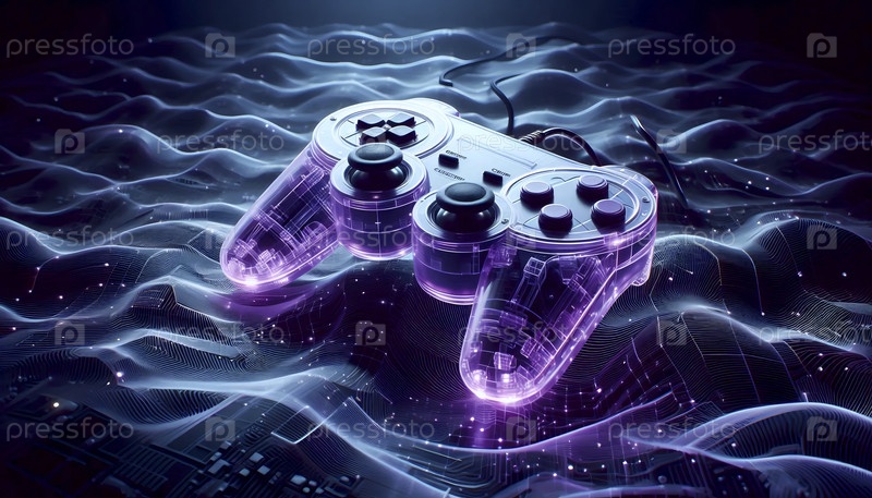Мокет трехгранного видеоигрового контроллера в атомном фиолетовом цвете, плавающий в киберпространстве, Ai generated image