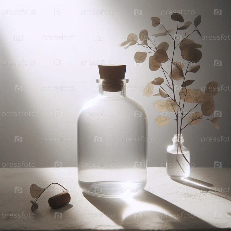 Мокет пустой прозрачной стеклянной бутылки с пробкой, рядом с высушенным эвкалиптом, Ai generated image