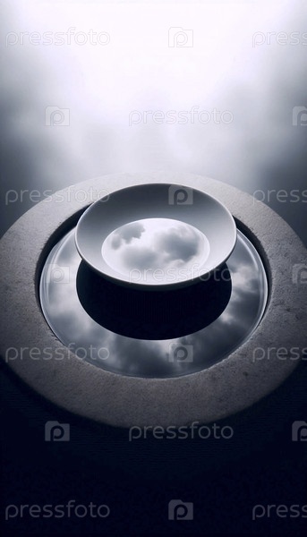 Мокет одной белой фарфоровой пластины, плавающей в бассейне мелководной воды, Ai generated image