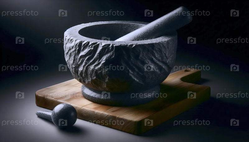 Макет из тяжелого гранитного раствора с пестилем в стороне, на деревянной плите, Ai generated image