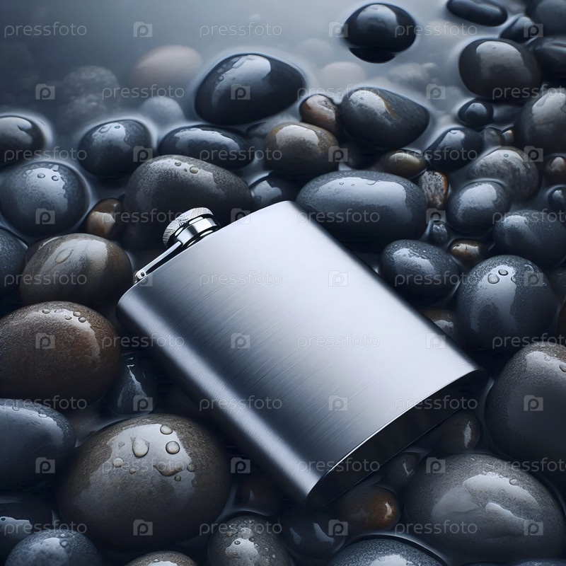 Мокет бутылки из нержавеющей стали на гранитном пляже, Ai generated image