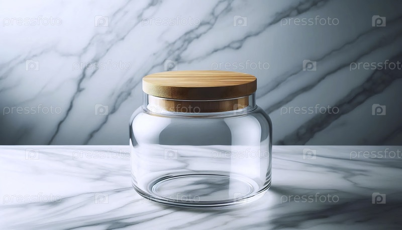 Макет пустой стеклянной банки с бамбуковым крышкой, на мраморной поверхности, Ai generated image