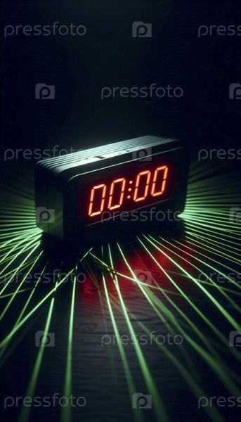 Мокет черного цифрового будильника с красными LED-номерами, в темной комнате с лазерной сеткой