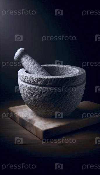Макет из тяжелого гранитного раствора с пестилем в стороне, на деревянной плите, Ai generated image