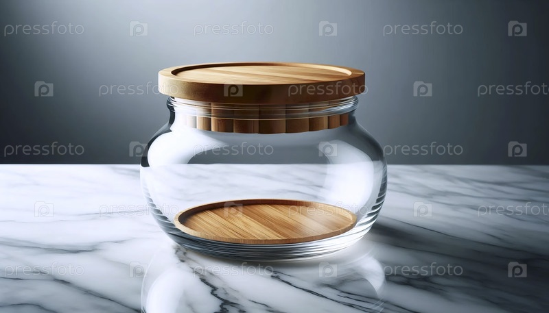 Макет пустой стеклянной банки с бамбуковым крышкой, на мраморной поверхности, Ai generated image