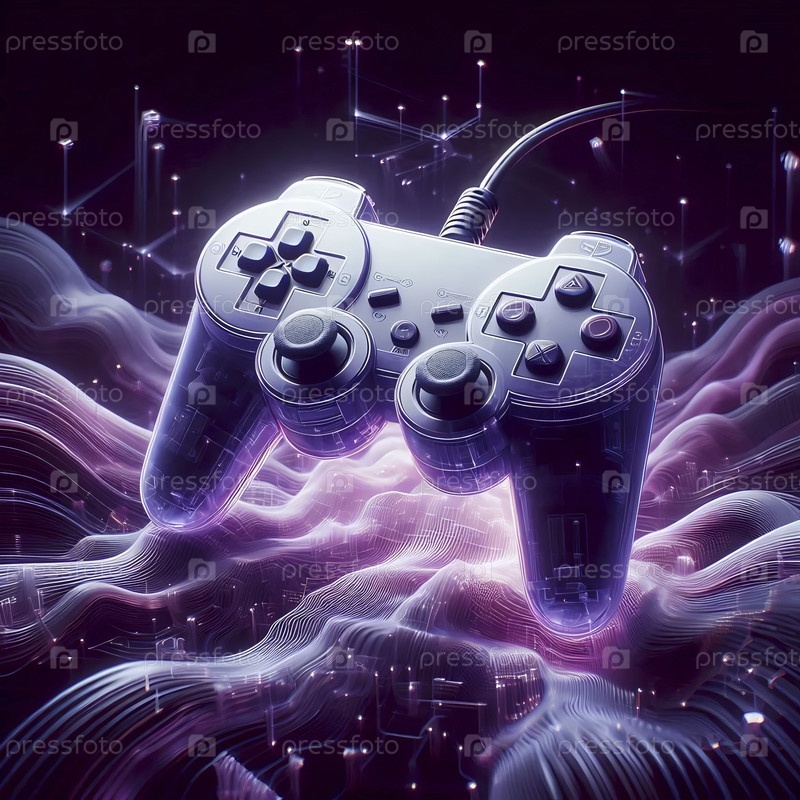 Мокет трехгранного видеоигрового контроллера в атомном фиолетовом цвете, плавающий в киберпространстве, Ai generated image