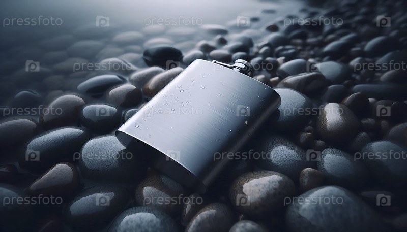 Мокет бутылки из нержавеющей стали на гранитном пляже, Ai generated image