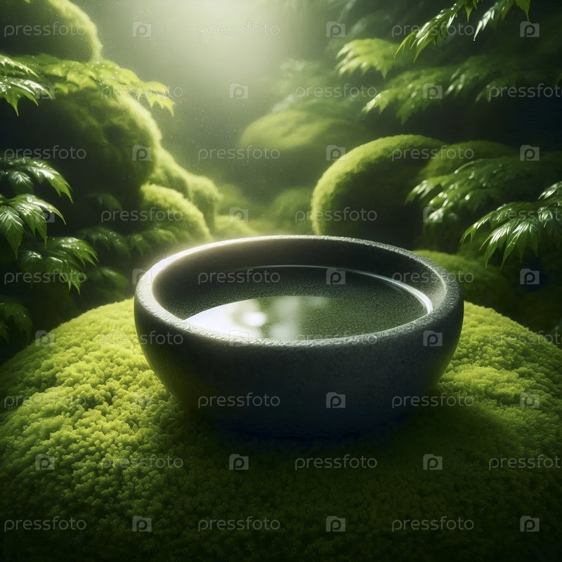 Мокет неглубокой каменной чаши с водой для созерцания, в ложе моха, Ai generated image