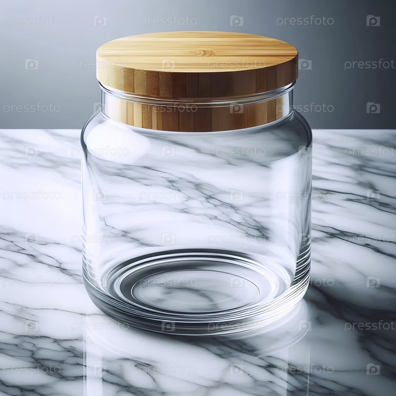 Макет пустой стеклянной банки с бамбуковым крышкой, на мраморной поверхности, Ai generated image