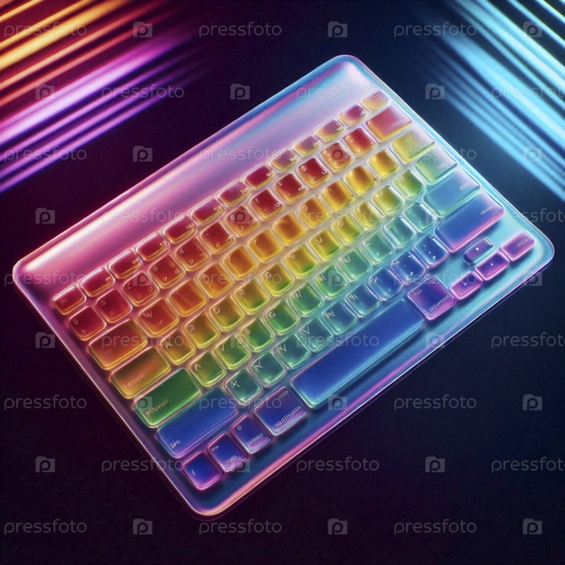 Прозрачный макет кожи клавиатуры с радужным гелем, установленный на стеклянном столе, Ai generated image