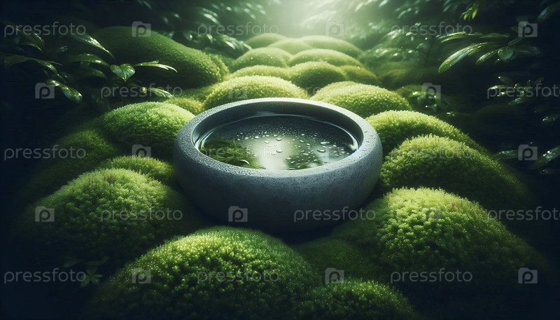 Мокет неглубокой каменной чаши с водой для созерцания, в ложе моха, Ai generated image