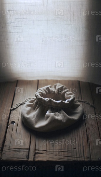 Макет минималистического некрасивого льняного мешка на выветрившемся дубе, Ai generated image