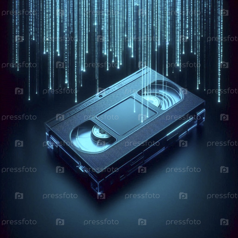 Светящийся циановый макет VHS-ленты, подвешенный в темном пространстве с цифровым дождем, Ai создал изображение