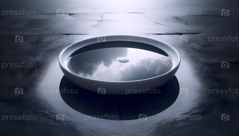 Мокет одной белой фарфоровой пластины, плавающей в бассейне мелководной воды, Ai generated image