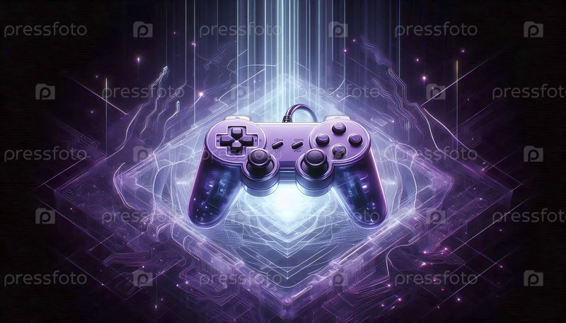 Мокет трехгранного видеоигрового контроллера в атомном фиолетовом цвете, плавающий в киберпространстве, Ai generated image